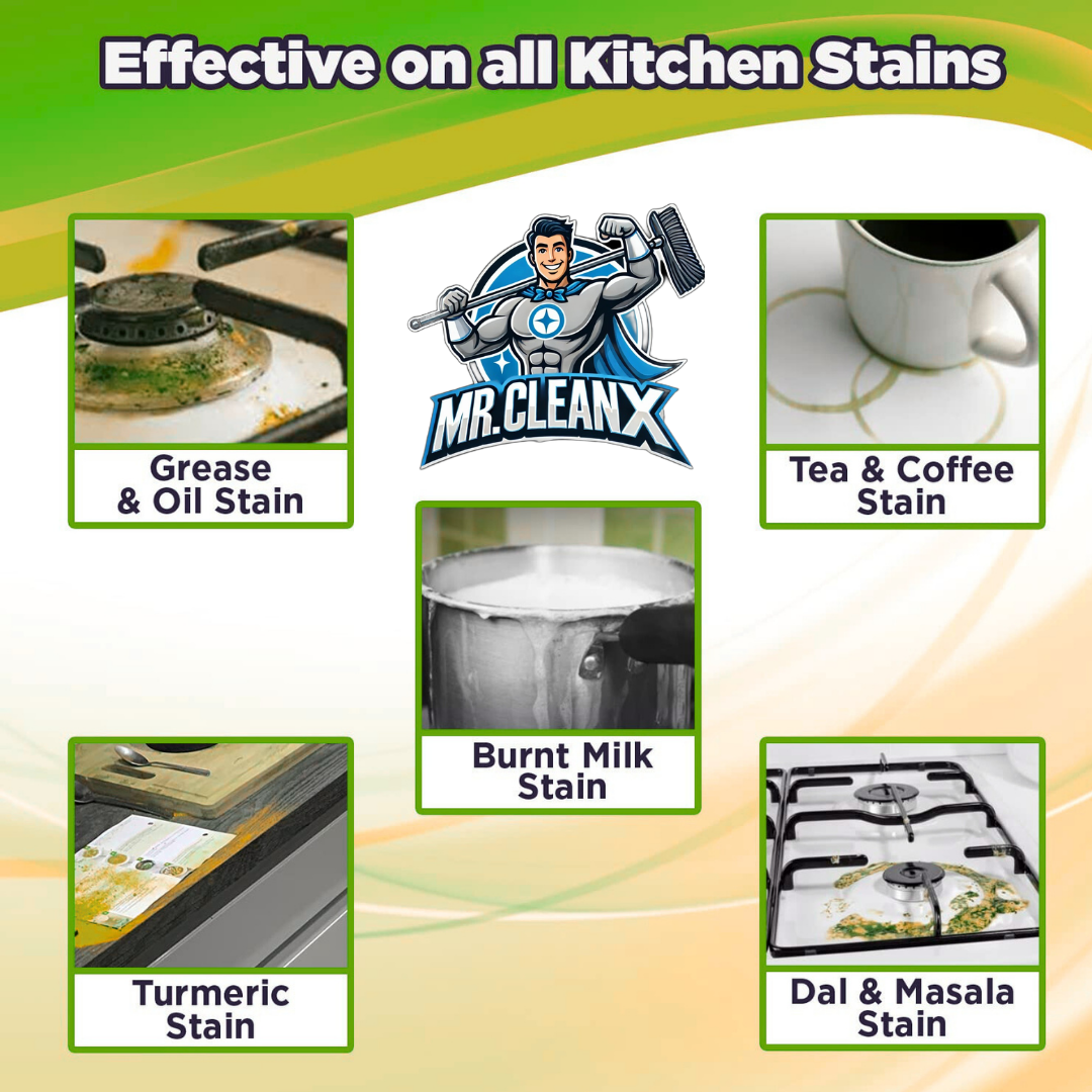 Indian cooking is delicious, but it leaves behind tough stains that regular cleaners just can’t handle. Meet Mr. CleanX Strong Green Kitchen Cleaner, the heavy-duty solution designed specifically for the Indian household. Whether it is deep-frying residue on the chimney or turmeric splashes on the tiles, our advanced formula makes cleaning effortless, earning its reputation as the best kitchen cleaner spray in India.